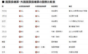 こうした国際比較の中で日本の制度は極めて異質である。日本には外国国旗損壊罪が存在する一方で自国の国旗については刑事罰が設けられていない。英米型のように「いずれも処罰しない」わけでもなく、欧州型のように「いずれも保護する」わけでもない。結果として日本は「外国のみ保護する」という非対称な構造にとどまっている。