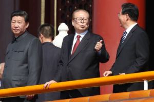 抗日戦争勝利70周年軍事パレードにおける習近平、江沢民、胡錦濤