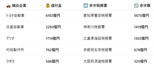 それではなぜ多くの税務署が赤字になってしまっているのか。それは輸出企業に対する消費税の還付金が高額であるからだ。豊田税務署はトヨタ自動車に6102億円、神奈川税務署は日産自動車に2283億円、海田税務署はマツダに1714億円、右京税務署は村田製作所に762億円、浪速税務署はクボタに566億円、刈谷税務署はデンソーに1058億円の消費税を還付している。収納した税収よりも消費税の還付金の方が高額であるために税務署の収支がマイナスになっているのだ。(2023年データ元・全国商工新聞2024年9月23日より)