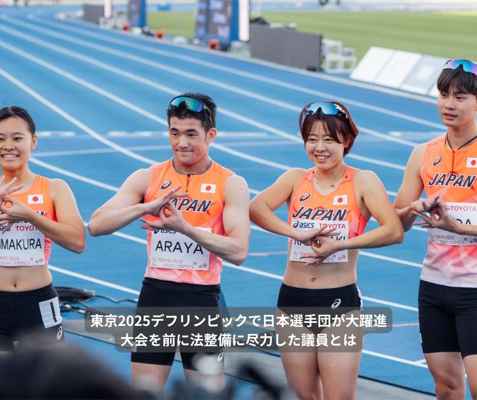 さて、デフリンピック開催を前に国会では「手話に関する施策の推進に関する法律」(手話推進法)が成立した。議員立法として主体的に取り組んできたのは今井絵理子参議院議員である。今井議員のご子息が聴覚障害者であることから当事者としての経験も踏まえての取り組みである。手話推進法の基本的施策は